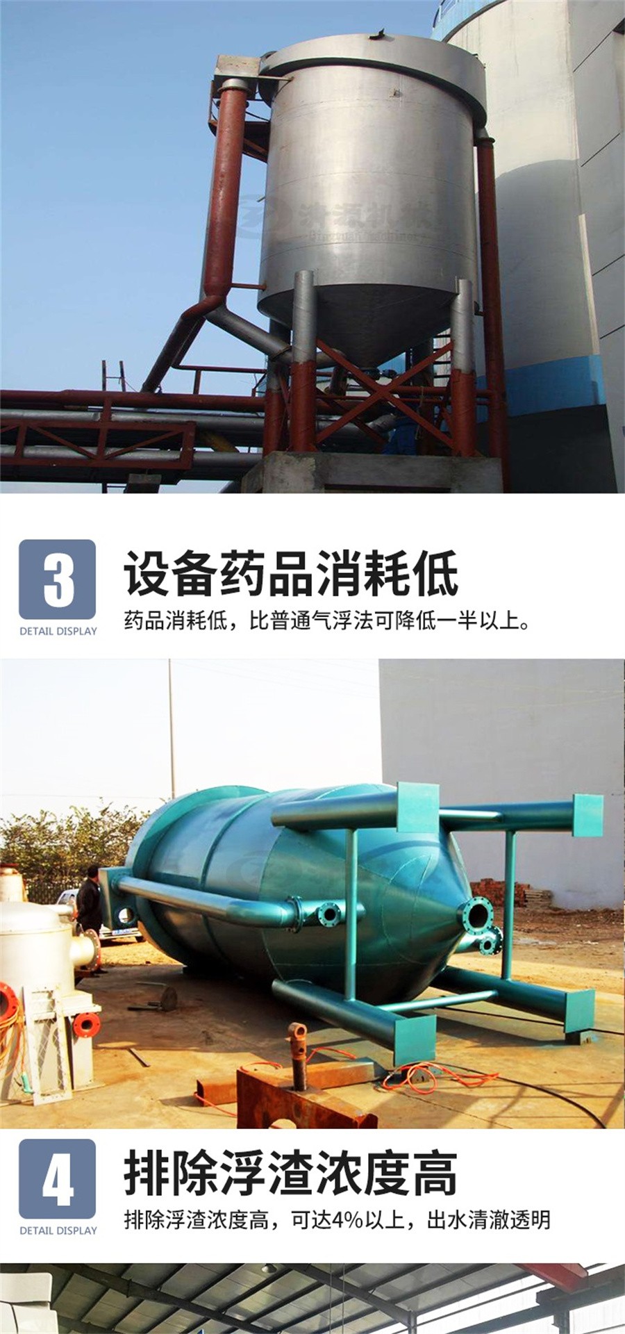 該設備結構緊湊,小型化、占地面積小:如日處理1000-4000平方厘米紙機白水量,該設備高度僅5.5米,占地10平方米,完全可以按照車間內部。 動力消耗小,比普通氣浮可降低50%以上。 藥品消耗低,比普通氣浮法可降低50%以上。排除浮渣濃度高,可達4%以上,出水清澈透明,SS去除率達96%以上,非容性COD可全部去除。
