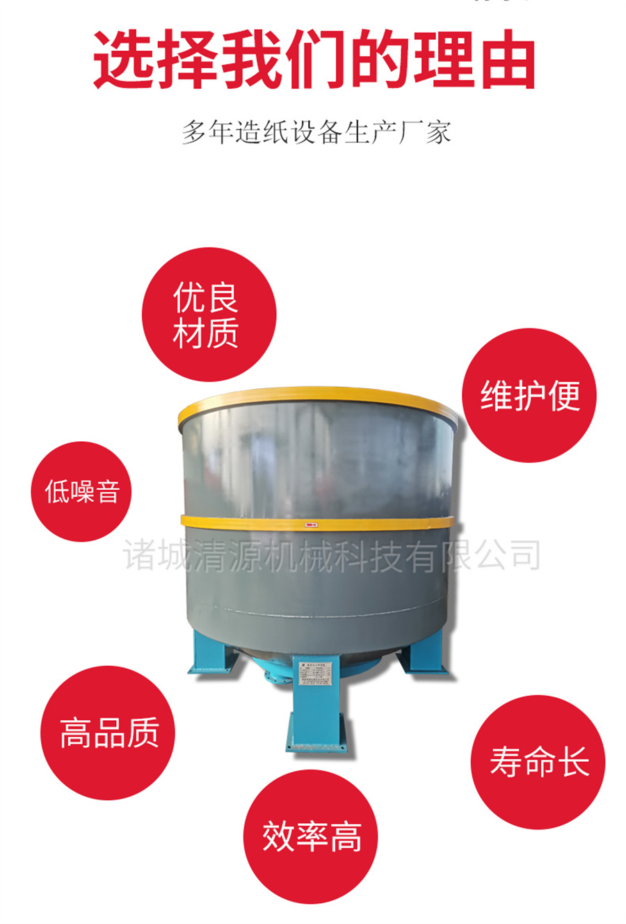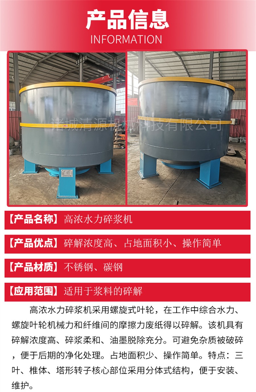 立式水力碎漿機:主要結構有槽體、轉子(葉輪)、底環和電機等。一般轉盤的圓周速度為1000m/min,槽體直徑為1-6m。我國目前水力碎漿機的容積有1-30立方等多種型號。