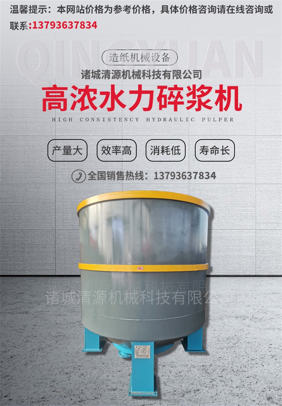 高濃水力碎漿機概述: 高濃水力碎漿機是廢紙脫墨制漿中不可缺少的設備之一,它的作用除把廢紙碎解為紙漿外,還有使紙漿纖維在轉子轉動中產生激烈的磨擦力,使印刷油墨通過化學藥品的作用從纖維表面脫落下來,從而達到再生利用紙漿的目的。